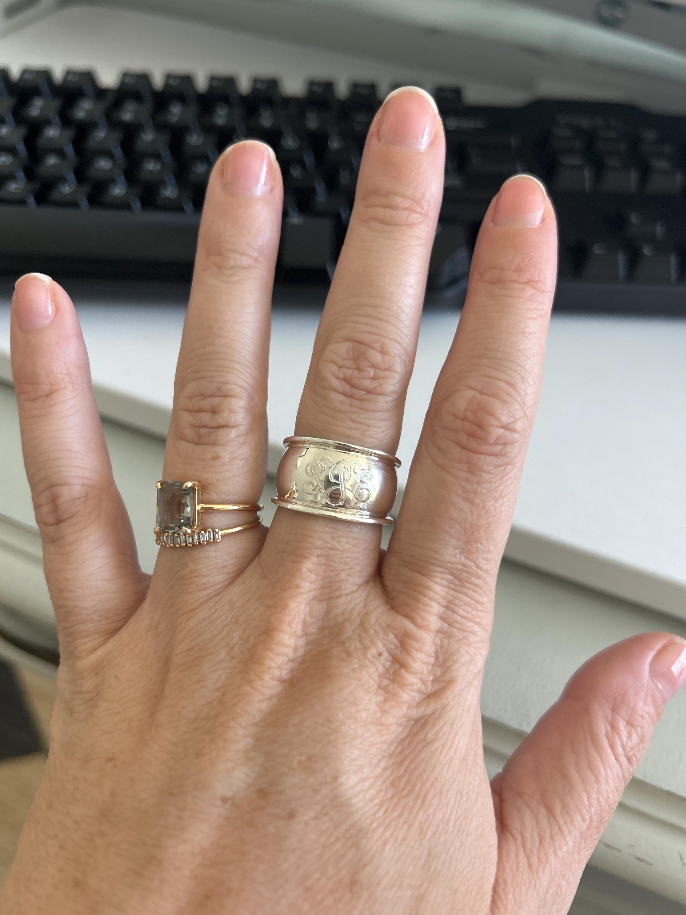 This ring is .5 inches wide in the front and tapers to a little over a quarter of an inch in the back.  The engraving on this ring is limited three letters.