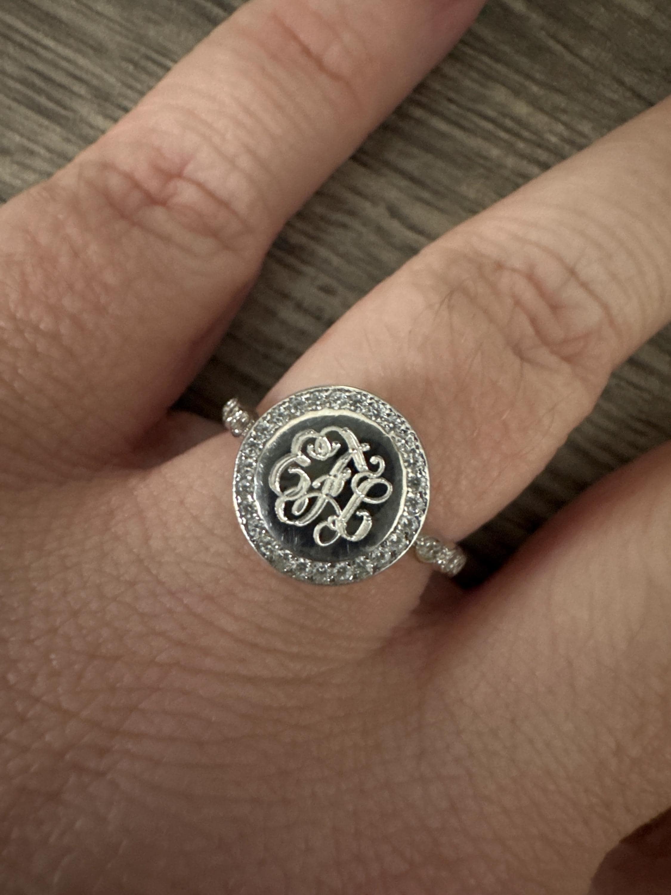 Beautiful Pure Sterling Silver 925 (not plated) monogram ring. Engravable area is 10mm. This ring is has cubic zirconia stones around the face. Thie ring is small and dainty. The Engravable face is about the size of a large green pea to help you get an idea of size and weight.